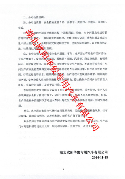 發布日期:2014-11-19 17:02:01 編輯:歐陽華俊 瀏覽量:20452014年11月,是我們湖北歐陽華俊掛車廠生產的旺季,公司董事長及各部門經理在注重半掛車產量的同時更注重產品的質量和員工的安全。再此,公司召開了安全質量管理大會,我公司秉著對企業形象的提升,產品質量的完善以及對客戶負責的原則,一切以市場為導向以客戶需要為第一,堅決杜絕生產劣質品。正因為我公司一直堅持這樣的原則,才有了更多的朋友對我廠的更多信賴,口碑相傳,才得以在半掛車市場持續低迷的狀態下脫穎而出,穩步發展。公司在抓生產的同時更抓安全和產品質量,這才是湖北歐陽華俊半掛車廠能長期美好發展的關鍵。