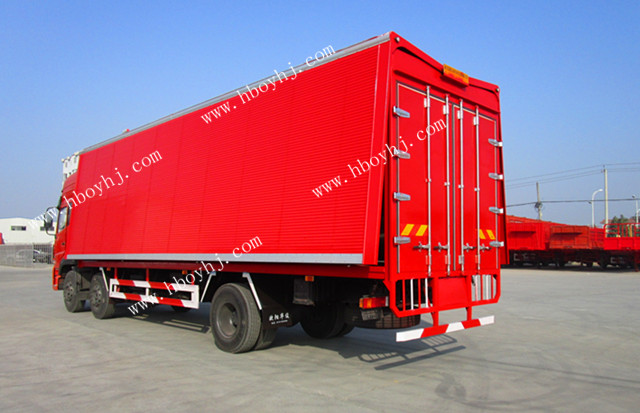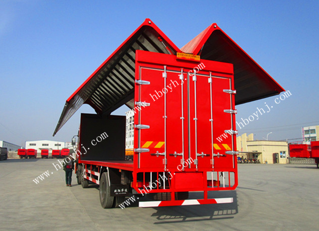 ◆ 產品特點:本公司生產的9.6米翼開啟廂式車(9米6飛翼車廂)密封性好,防雨、防塵、防曬、防盜、耐腐蝕.適合機械快速裝卸,速度快、效率高、省時間、省人工,節約成本飛翼車由于其具有裝卸速度快,效率高,已經是現代物流企業十分青睞的運輸工具.我公司生產的飛翼車廂,原理是通過電瓶放電經動力單元推動液壓系統工作達到舉升的作用。由于飛翼車廂具有裝卸速度快,效率高,可側面裝卸等優點,已經是現代物流企業十分青睞的運輸工具。翼開啟廂式車廂已成為大型物流公司運輸的很佳選擇,由于近幾年,大量輕質新材料應用于飛翼車廂,使得車廂自重降低,加之車廂設計美觀,貨物運輸安全可靠,預計在高端物流運輸市場將會占有一席之地。