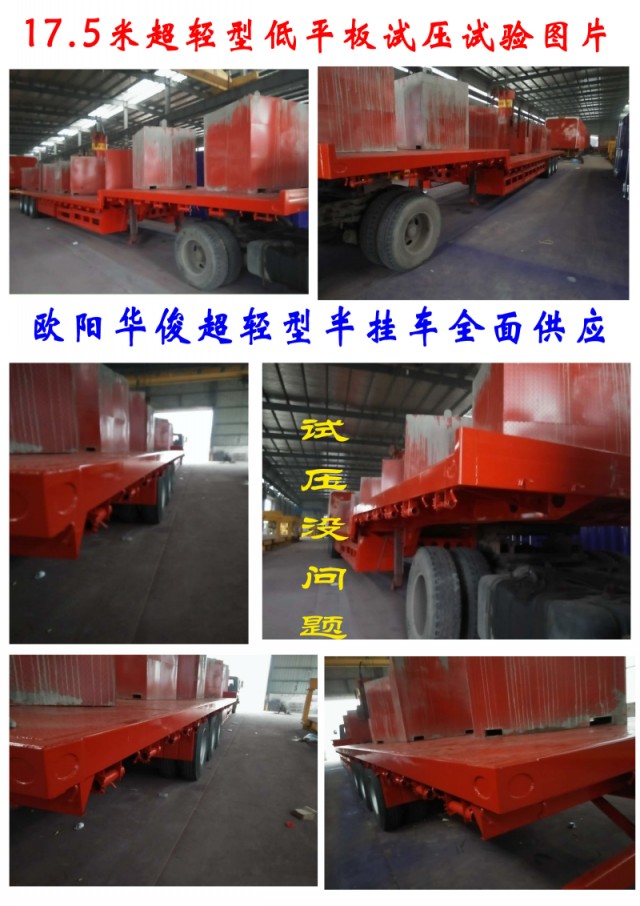 自歐陽華俊推出超輕型低平板半掛車以來,深受廣大司機(jī)朋友們的關(guān)注,咨詢量及訂車對(duì)換的客戶越來越多。現(xiàn)公布一下超輕型半掛車(低平板半掛車和倉欄半掛車)的試壓試驗(yàn)圖片。我們的超輕型半掛車在客戶提車時(shí)由我們的檢驗(yàn)人員進(jìn)行質(zhì)量檢驗(yàn),讓大家放心裝貨,多掙錢回家。