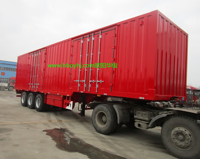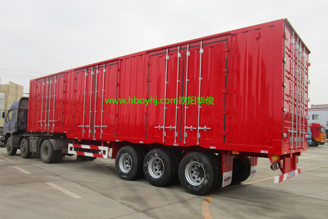 歐陽華俊生產的廂式半掛車采用高強度的冷扎瓦楞鋼板,無骨架結構,中心遍地,多樣選擇,裝貨空間大,箱體內合理分布,具有多拉、重載、自重輕的特點。整車車身采用優質鋼材,先進的技術,嚴格的生產工藝制造而成,整車結構合理,性能可靠,操縱簡便,外型美觀。