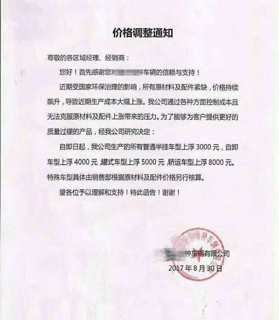 環(huán)保督察壓力太大,汽車零部件企業(yè)也不能幸免于難。很多小型零部件制造企業(yè),鑄造企業(yè)因環(huán)保排放不達(dá)標(biāo)被查封或倒閉,導(dǎo)致車橋、懸架、鋼板等零部件原材料價格上升,掛車生產(chǎn)制造成本直線增加,不得不漲價。