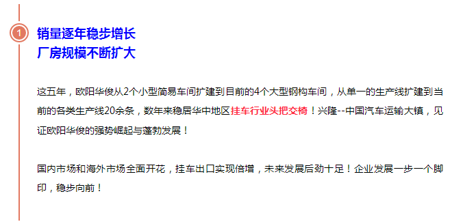 過去五年,歐陽華俊從一家汽車改裝廠一躍發展成為具有國家公告資質的專用車生產企業。為了取得這個專用車生產資質,公司歷經幾年的時間、投入巨資完善整改,在今年才正式申辦下來,背后的辛勤付出來之不易。有了國字牌的資質,歐陽華俊如虎添翼,將朝著由大做強的方向挺進發展,掛車行業,舍我其誰!