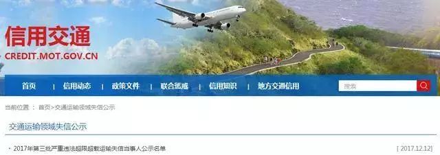 發布日期:2017-12-23 02:13:27 編輯:歐陽華俊 瀏覽量:4565根據交通運輸部等36個部門聯合簽署的《關于對嚴重違法失信超限超載運輸車輛相關責任主體實施聯合懲戒的合作備忘錄》,交通部分別于6月8日,9月28日,12月11日發布三批嚴重違法超限超載失信當事人信息(黑名單)。
