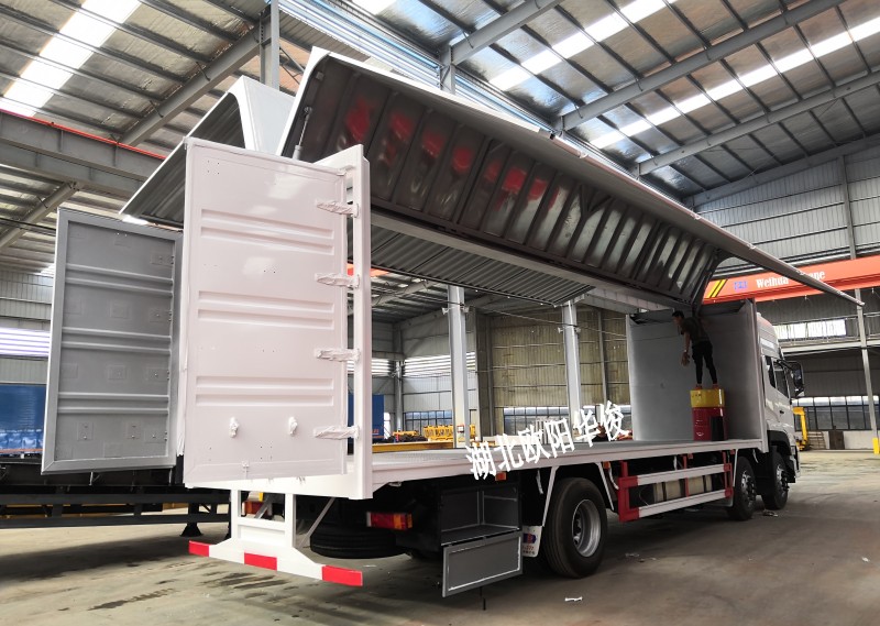 【結構設計】:飛翼車,是普通廂式車的改進,通過動力彈簧、手動裝置或液壓裝置, 能開啟車廂兩側翼板的專用車輛,該車頂部、前板后門結構同鐵瓦楞廂式車,側邊由翻轉板、上邊板、下邊板組成。改裝的各種功能性專用車都具有機動性強,移動方便,展開后能超大程度的利用車體內的使用空間,并能夠快速展開和收起,內部空間寬大舒適。