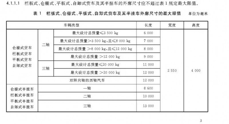 為此,查詢了GB1589-2016《汽車、掛車及汽車列車外廓尺寸、軸荷及質(zhì)量限制》。其中,對于車輛外廓尺寸的要求中,非常清晰的可以看到,無論是倉柵式半掛車、欄板式半掛車、平板式半掛車、自卸式的貨車還是其他類型的半掛車,整車高度很高不得超過4米。