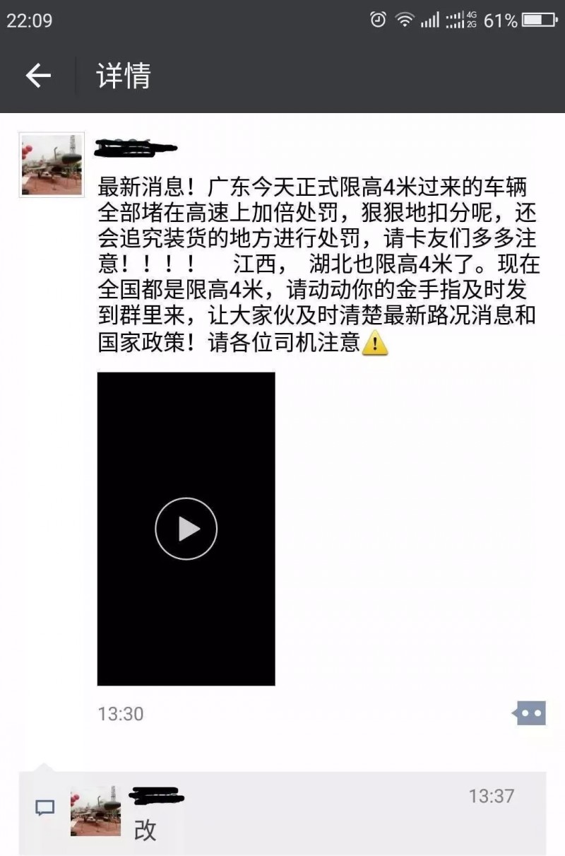 目前,很多微信群及朋友圈都在傳這么一件事:“XX今天正式限高4米過來的車輛全部堵在高速上加倍處罰,狠狠地扣分呢,還會追究裝貨的地方進行處罰,請卡友們多多注意!!!!XX也限高4米了。現(xiàn)在全國都是限高4米,請動動你的金手指及時發(fā)到群里來,讓大家伙及時清楚很新路況消息和國家政策!!”