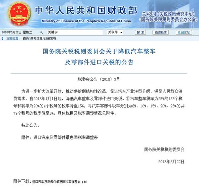 財(cái)政部公告:2018年7月1日起,降低汽車整車及零部件進(jìn)口關(guān)稅。將汽車整車稅率為25%的135個(gè)稅號(hào)和稅率為20%的4個(gè)稅號(hào)的稅率降至15%,將汽車零部件稅率分別為8%、10%、15%、20%、25%的共79個(gè)稅號(hào)的稅率降至6%。