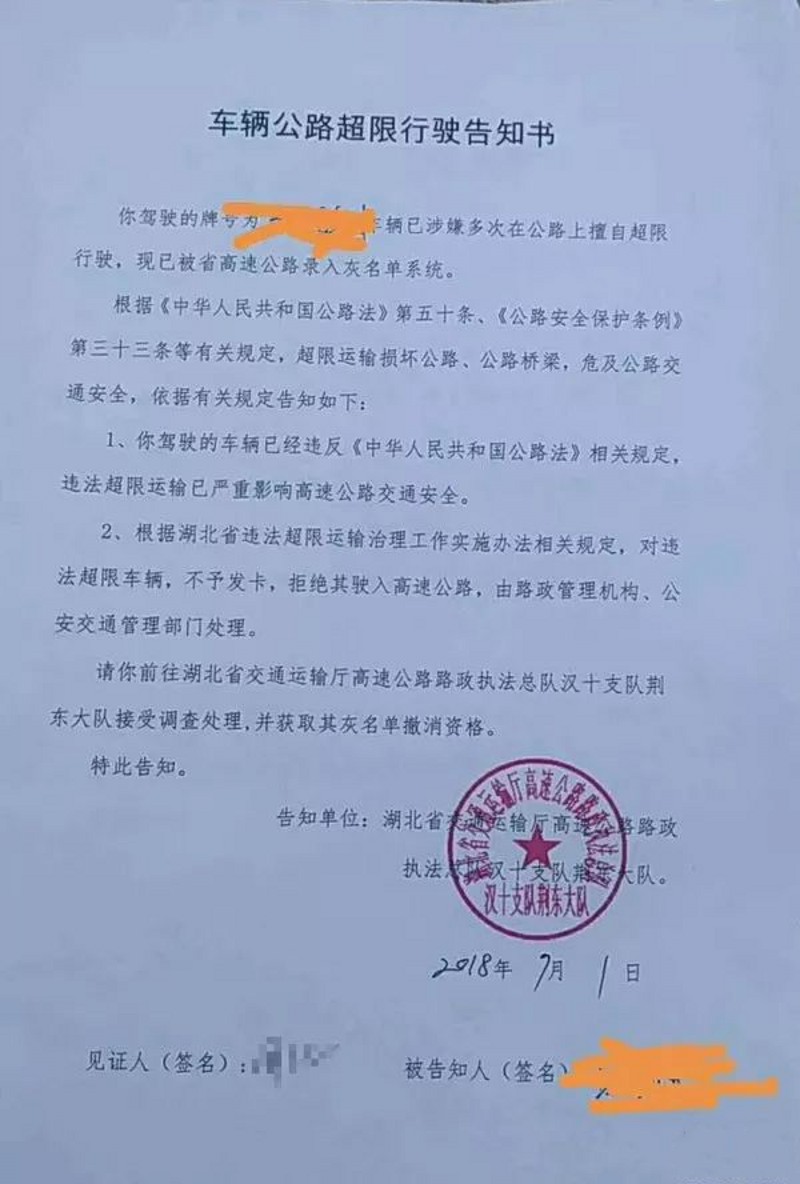 但很近,就有卡友曬出一則湖北省交通擁運輸廳高速路政執法大隊開出的《車輛公路超限行駛告知書》,在告知書中,我們看到卡友的車輛因涉嫌多次在公路上擅自超限行駛,現已被省高速公路錄入灰名單系統。