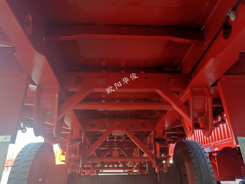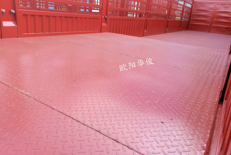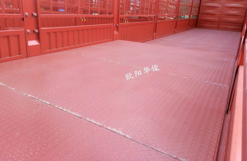 此車13米長×2.55米寬×1.8米高,華俊大紅,廂式對(duì)開門,廣東富華13T車橋,16T剎車,2.75mm花紋板,貫穿梁高板8#型材,低板100直型材,下鋪9根5#槽鋼,降低車身自重的同時(shí),可自由走叉車。