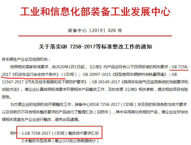 發(fā)布日期:2019-11-19 02:17:35 編輯:歐陽華俊 瀏覽量:33912019年10月28日,工業(yè)和信息化部裝備工業(yè)發(fā)展中心下發(fā)《關(guān)于落實GB 7258-2017等標準整改工作的通知》。