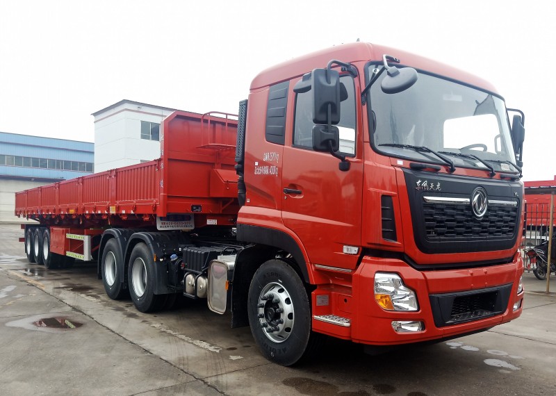 此側翻尺寸為:13米長×2.55米寬×2.9米高。墻板高度為60公分高,6支舉升油缸,1支移位油頂。該車左右兩邊都可翻,可有效提高運輸散裝零散貨物的運輸效率。適用于煤炭、礦石、泥沙、建筑物料等散裝零散貨物的運輸。