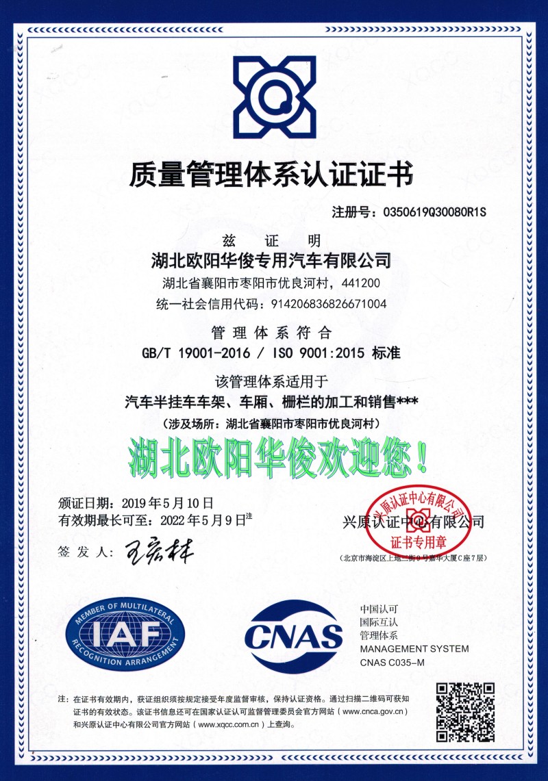 公司主要生產的車型有:倉柵式運輸半掛車、欄板式半掛車、平板式半掛車、翼開啟箱式(飛翼)半掛車、骨架集裝箱式半掛車、廂式半掛車、后翻/側翻自卸半掛車、小型載貨車、特種出口車等類型車廂。公司自成立以來,始終把質量放在首位,目前已建立了完善的質量管理體系,并通過了中國質量認證中心3C認證和ISO9001:2015國家質量管理體系認證。