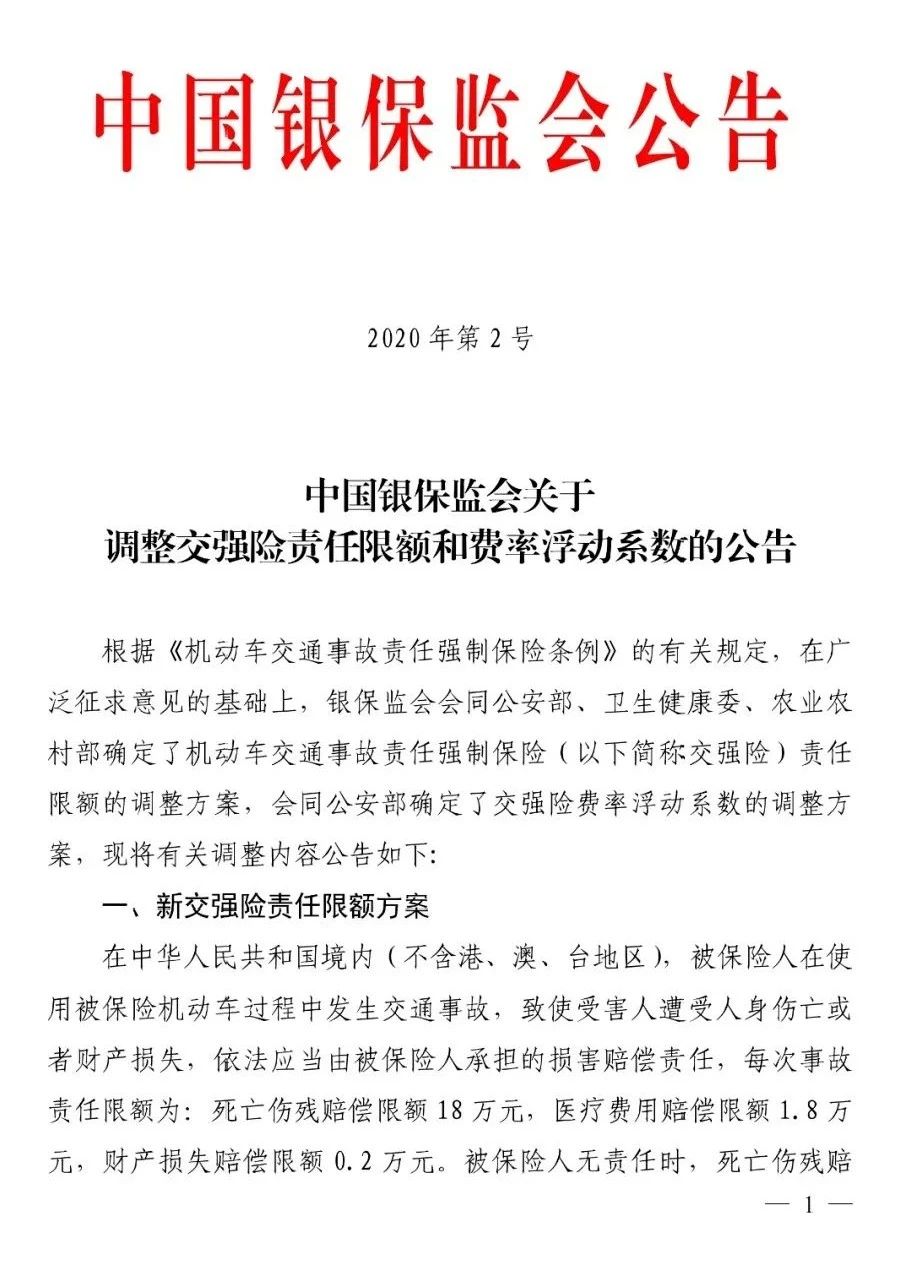 發布日期:2020-09-20 03:30:58 編輯:歐陽華俊 瀏覽量:21182020年9月9日,中國銀保監會發布《關于調整交強險責任限額和費率浮動系數的公告》(2020年第2號),將于2020年9月19日正式實施?!豆妗访鞔_,2020年9月19日零時后發生道路交通事故的,新、老交強險保單均按照新的責任限額執行。
