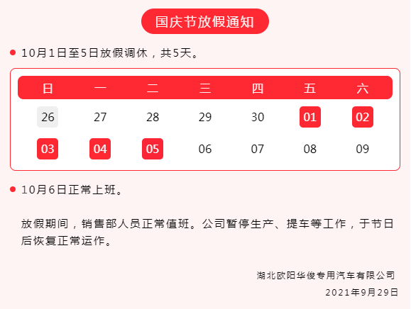 2021年湖北歐陽華俊國慶放假通知