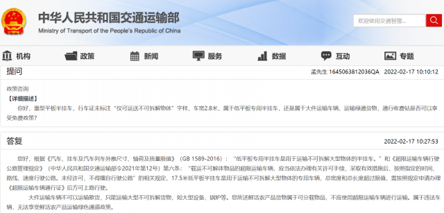 你好,重型平板半掛車,行車證未標(biāo)注“僅可運(yùn)送不可拆解物體”字樣,車寬2.8米,屬于低平板專用半掛車,還是屬于大件運(yùn)輸車輛,運(yùn)輸綠通貨物,通行收費(fèi)站是否可以享受免費(fèi)政策?
